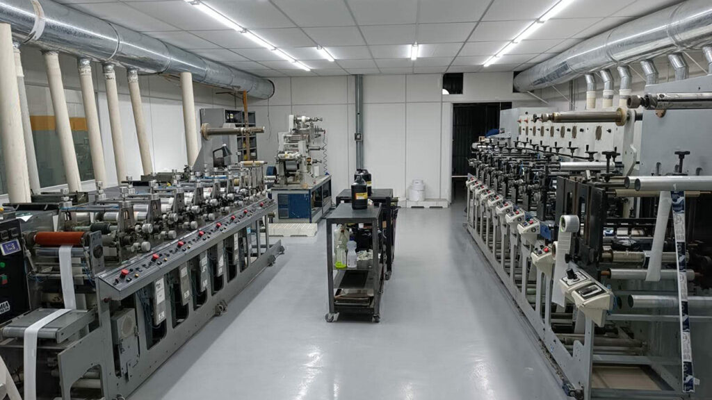 Em nossas máquinas flexográficas podemos fabricar rótulos em até 8 cores com acabamentos em Cold Stamping, impressão no adesivo e aplicação de verniz.